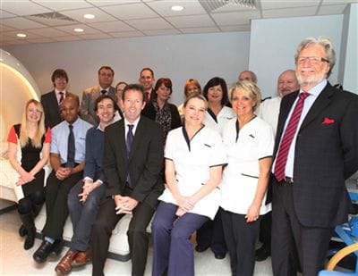 At The New Victoria Hospital are, back row, from left, Philips Healthcare account manager Gary Bailey and project manager Thomas Heneghan, radiographer Rosie Forrer, Philips general manager Neil Mesher, consultant radiologist Dr Sarah Evans, PR manager Dorothy Cassidy, radiographer Anne Saxon, consultant radiologist Dr Andrew Hine and radiographer Chris Bridger-Hurford. In front row are Philips customer care centre co-coordinator Julia Smith, help desk response centre engineer Paul Sutherland, field service engineer Alex Dinnage, Wimbledon doubles champion Jeremy Bates, MRI imaging manager Gayle Hoffmann, imaging manager Barbara Hutton and hospital ceo Graham Ball.